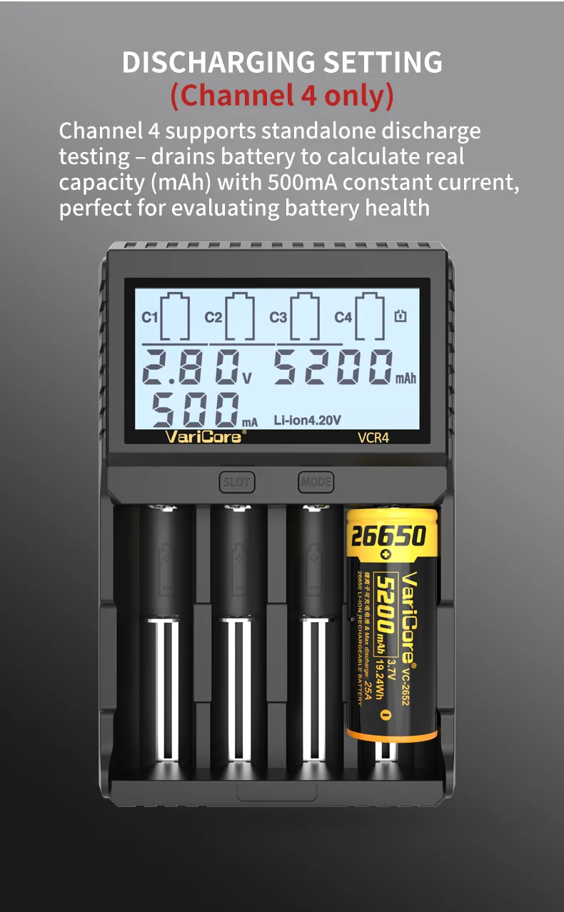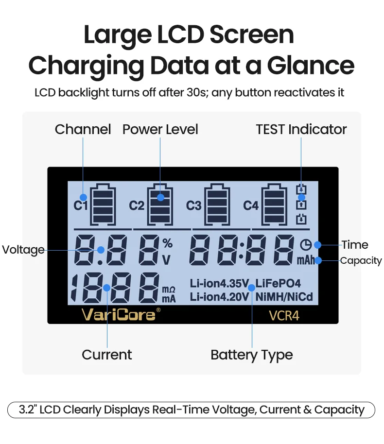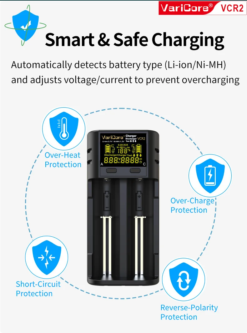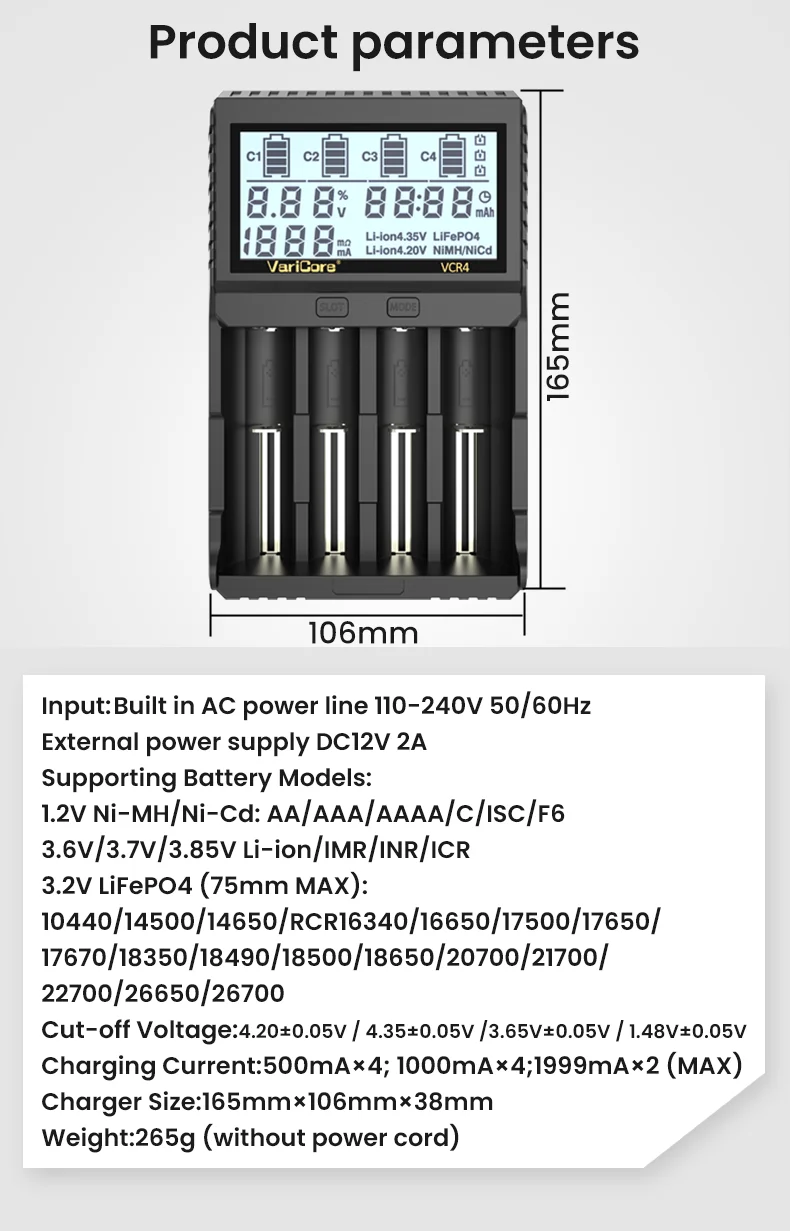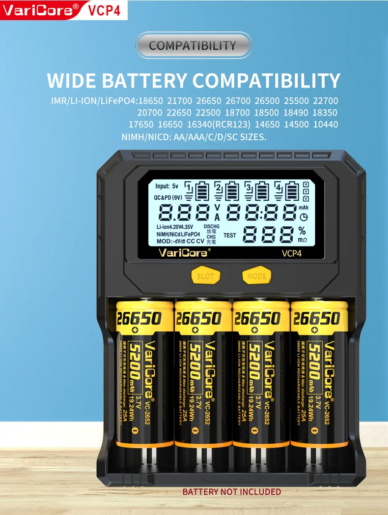 VCQ4 TC2 R4 Intelligent Battery Charger Portable for 3.7V Lithium 18650 26650 21700 18500 18350 1.2V NI-MH Ni-Cd AA AAA